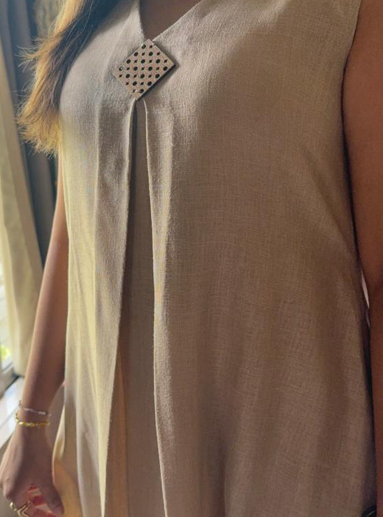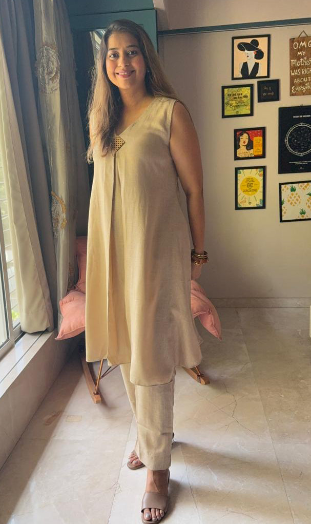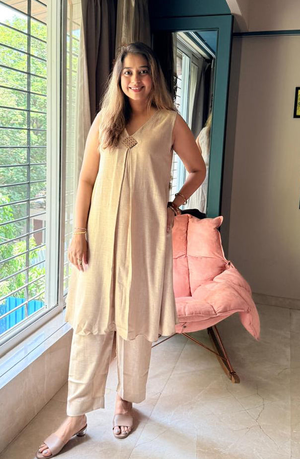 Beige Linen Kurti Set with Pockets & Separate Sleeves