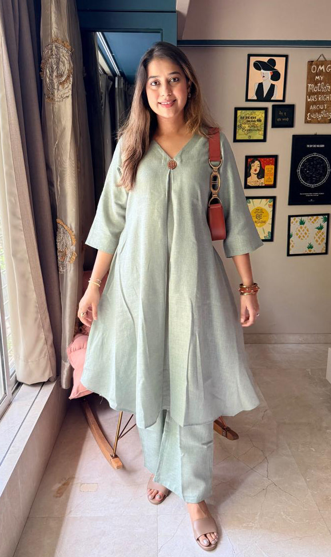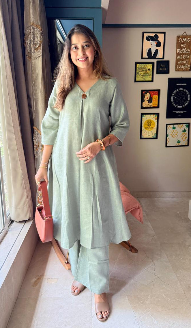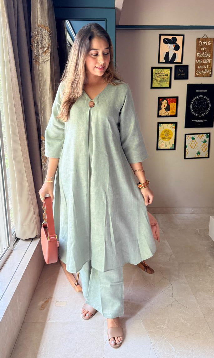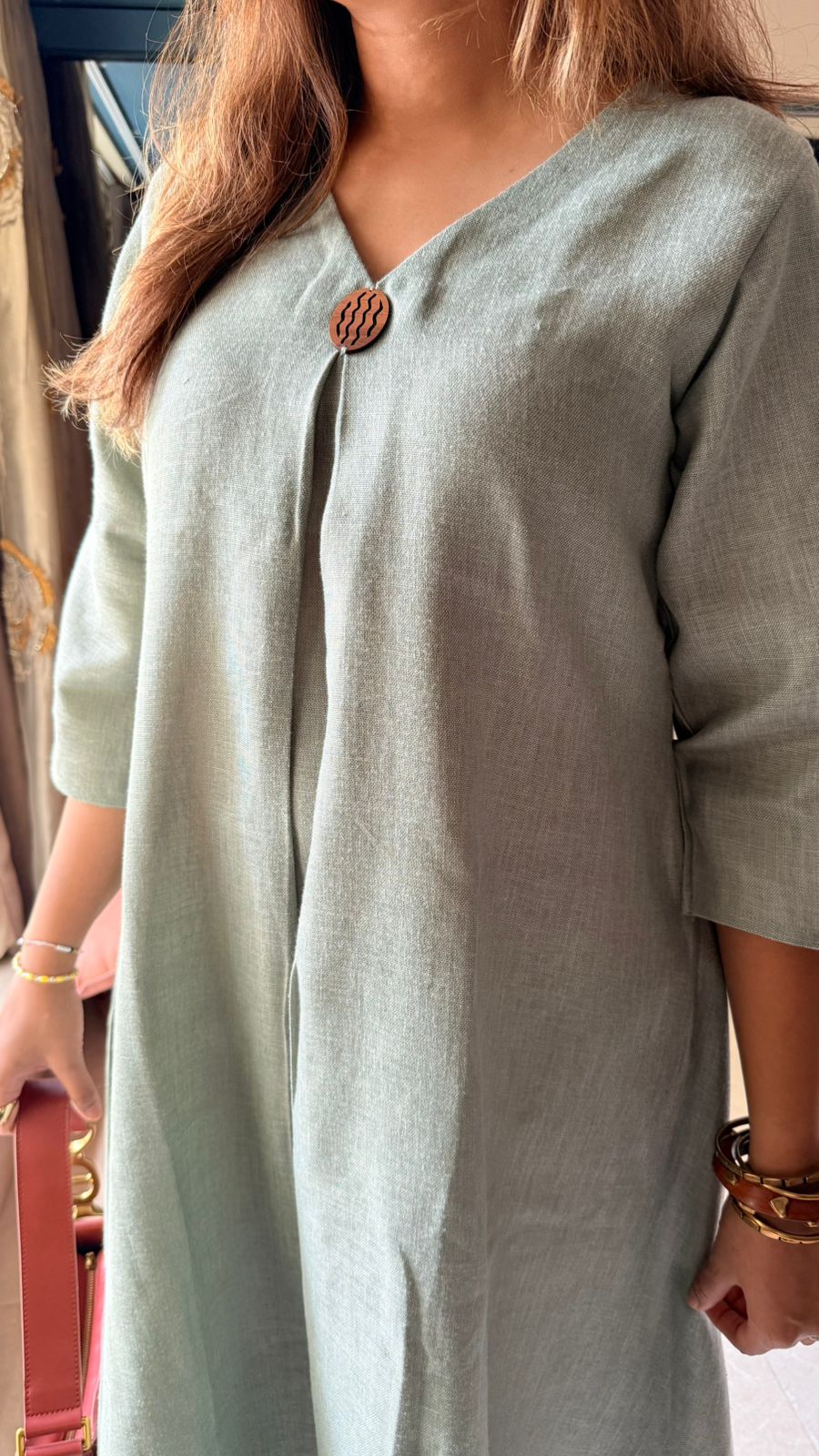 Kurta – A soothing sage green kurta crafted in breathable linen fabric, designed for effortless everyday elegance. The highlight is the minimal wooden statement button at the neckline paired with a soft front pleat that adds fluidity and structure. The relaxed A-line silhouette ensures comfort while maintaining a clean, refined look. Finished with elbow-length sleeves and pockets for easy, versatile styling.