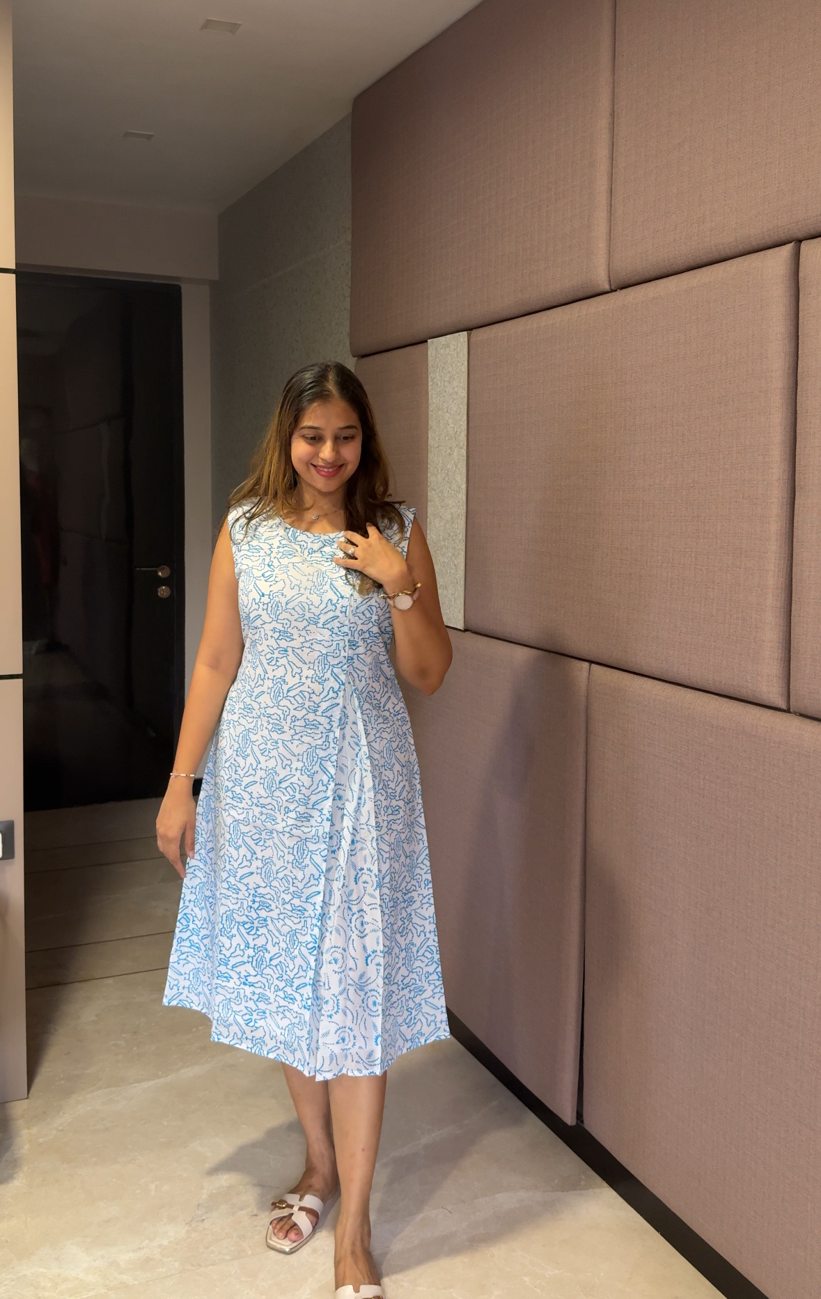 White & Blue Printed Sleeveless A-Line Dress for Women