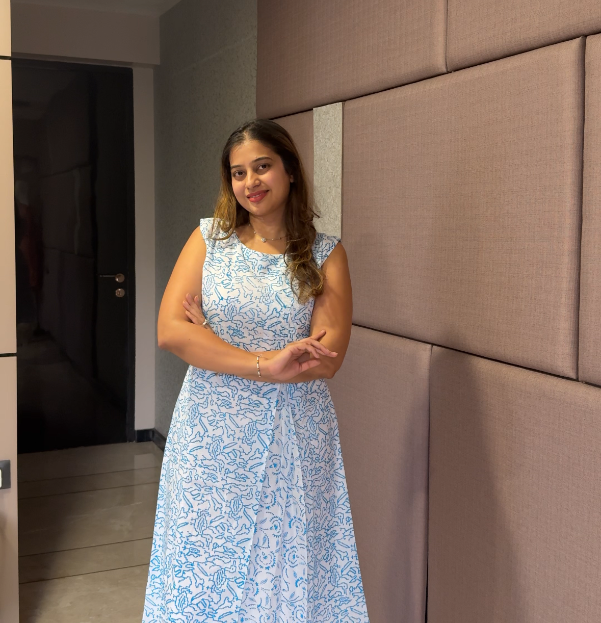 This elegant white base dress with blue abstract floral print which comes in round neck with sleeveless pattern and contrast side panel detailing. Designed in a flattering A-line silhouette making it perfect for daily wear, casual outings, brunch dates and summer western wear for women. The dress has full cotton lining and comes with a pocket