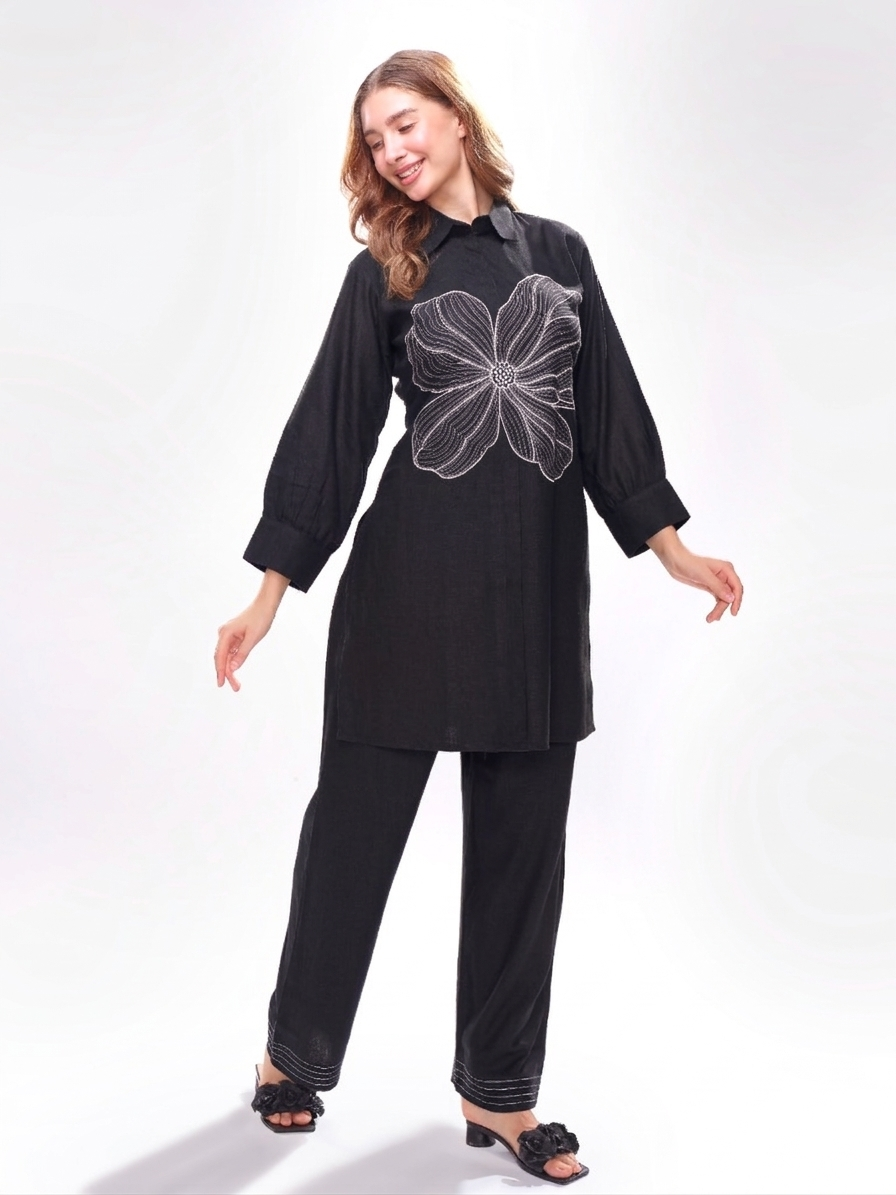 Pure Linen Co-ord Set With Abstract Flower Embroidery