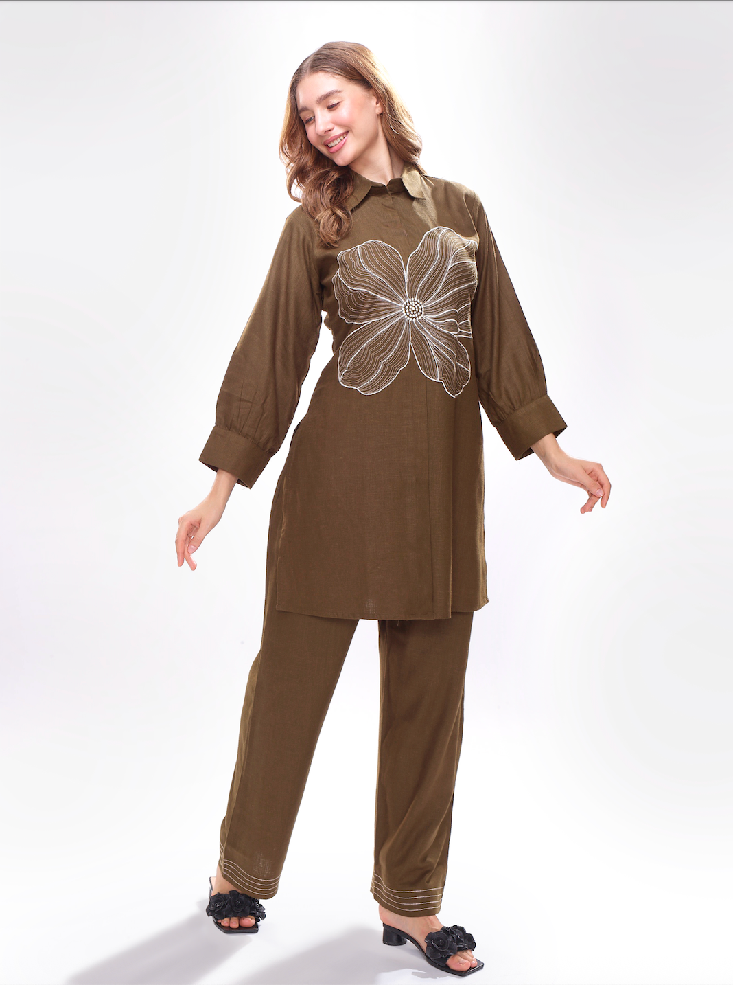 Pure Linen Co-ord Set With Abstract Flower Embroidery